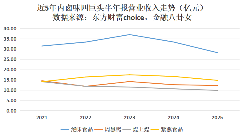 营业收入看,四家巨头都在下滑,下滑得最厉害的莫过于绝味,从2023年的37亿已经下滑到了28.2亿,减少了8.8亿元。