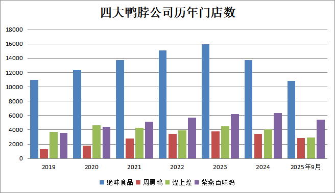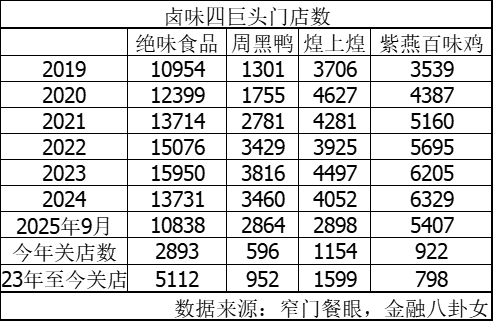 从2023年年底到今年9月8日,周黑鸭、煌上煌和紫燕百味鸡也分别关店952、1599、798家,加上绝味的,四大巨头合计关店8461家。